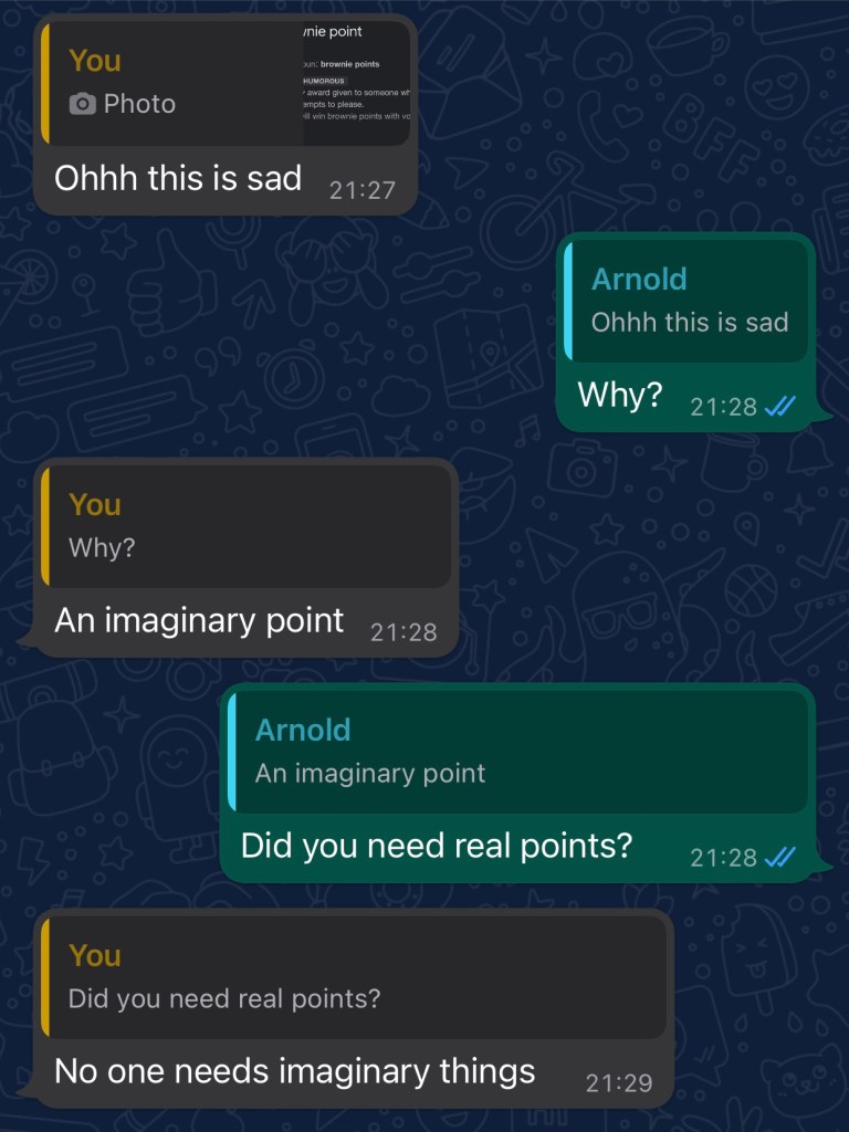 I send him a screenshot of a definition of brownie points from Google.